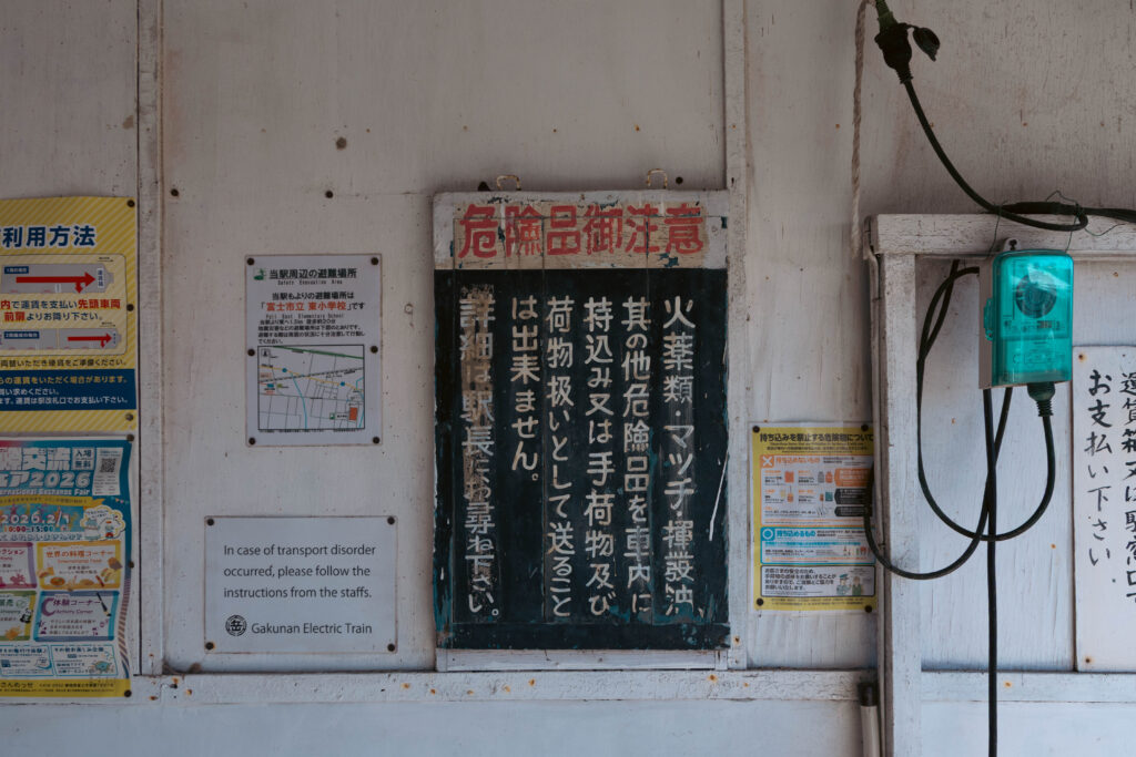 危険品に関する、古めかしい注意看板。途中「荷物扱い」という表記がありますが、岳南江尾駅発着の貨物列車が廃止されたのは1984年なので、それ以前からあるということなのか。2026年現在、当駅に駅長はおりませんので、詳細は運転士に尋ねましょう。
