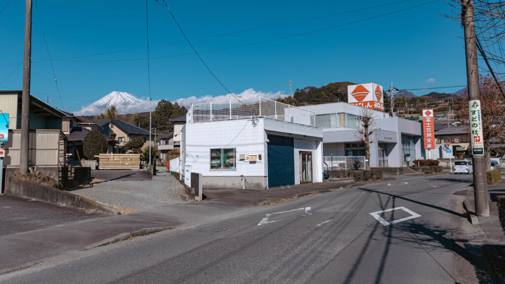 何の変哲もない道の先に、富士山。