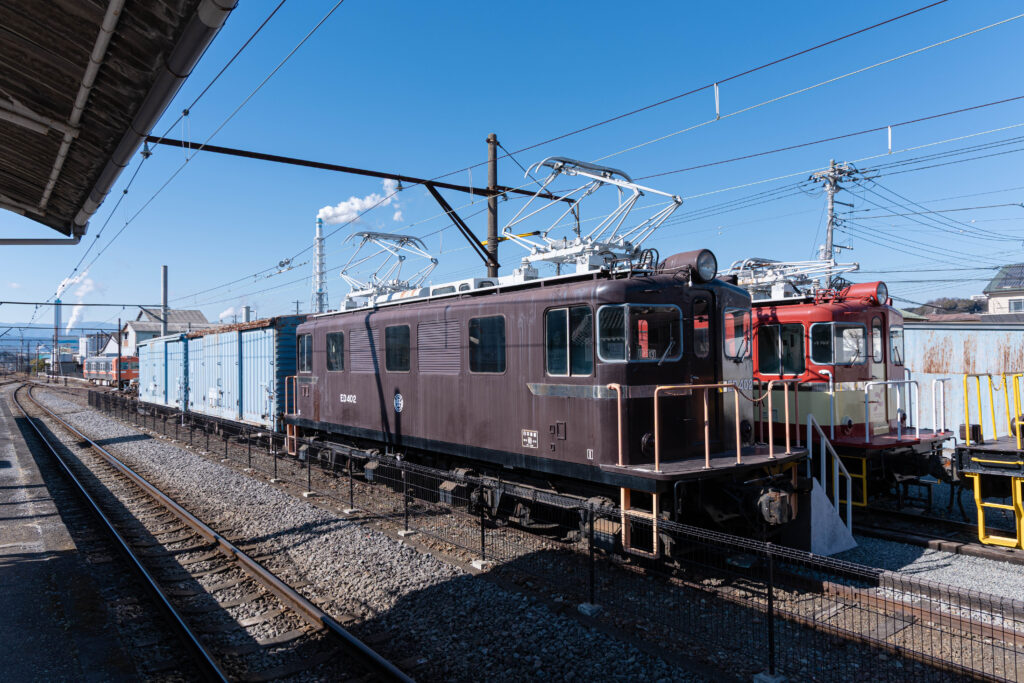 ED402(奥)とED403(手前)は、岳南電車の主力機関車として本線上で貨物編成を牽引しました。1965年~66年に日本車輌で製造され、当初は松本電鉄(現・アルピコ交通)でダム建設の資材輸送用として活躍していました。ダム完成に伴い仕事の大部分を失ったところで、牽引力の高い電気機関車を探していた岳南鉄道(当時)関係者の目に留まり、1971年に転属。以後、2012年の貨物輸送廃止まで、その任を務め続けました。