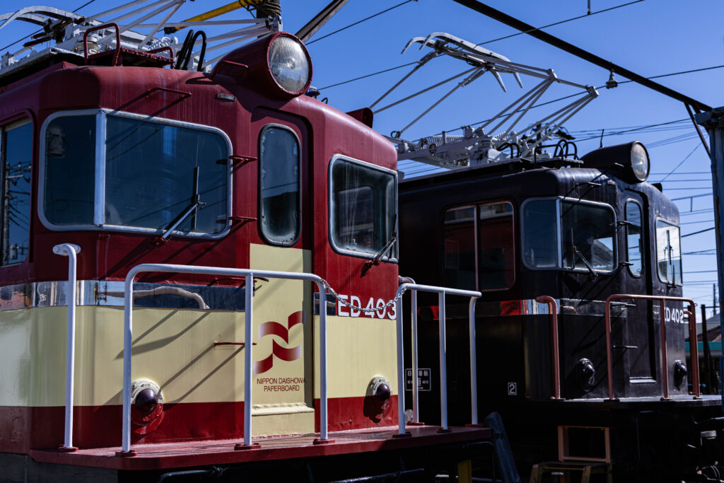 なお、ED403は2005年に貨物輸送の荷主であった日本大昭和板紙吉永(現日本製紙)株式会社の特別塗色として、塗色を赤とクリームの2色に変更。晩年には赤色の部分のみ元のぶどう色に戻して運行最終日を迎えましたが、展示にあたって往時の塗装が復刻されています。