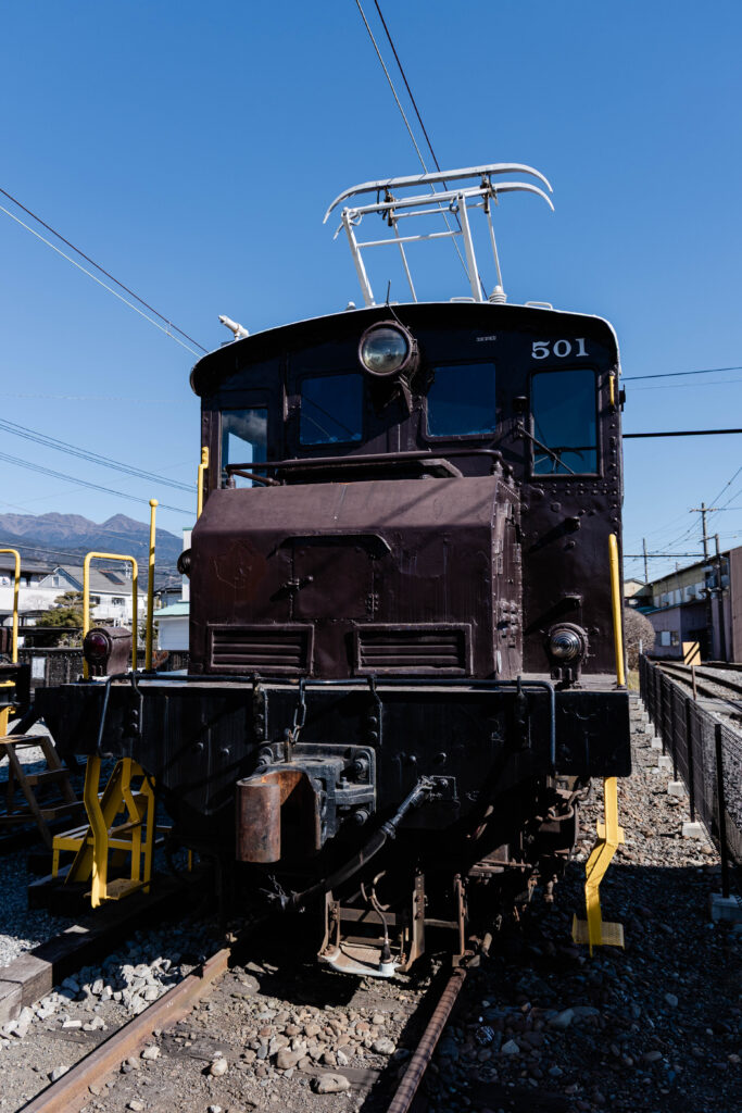 ED501は入換機関車として、比奈駅構内で貨物編成の入換作業に従事しました。1928年に川崎造船所(現川崎重工)で製造され、上田温泉電軌(現上田交通)、三河鉄道(現名鉄三河線)、名古屋鉄道と転属を繰り返し、1969年に岳南鉄道へ入線。無骨なスタイルに、入換機関車らしい警戒用の黄色い手摺がオツな車輌です。