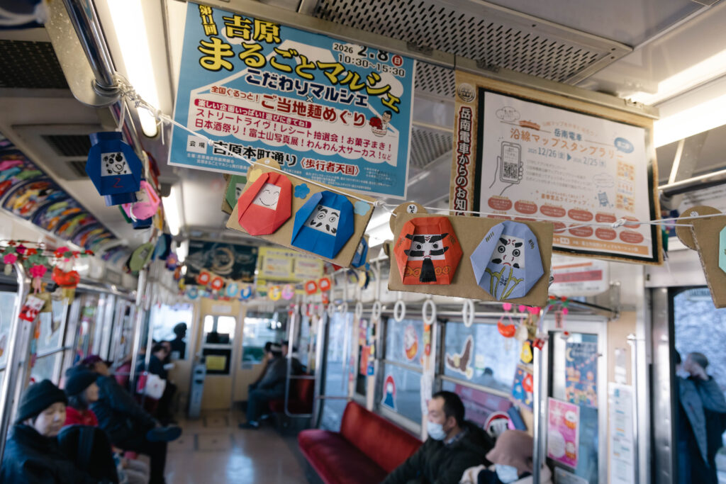 本吉原から岳南富士岡へ。乗車した7001号は「だるま電車」仕様ということでこの賑わい。色とりどりのだるまの折り紙が車内を彩ります。