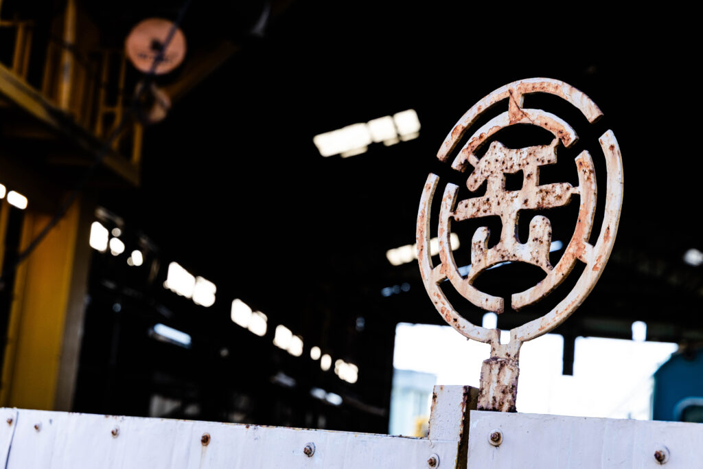 門扉には岳南電車の社章が。なんとも味わい深い装飾です。「岳」の字を繋ぐ部分の細さを見るに、大事に手入れしないとポロっと取れてしまいそう。
