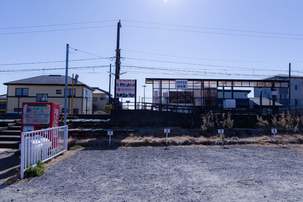 神谷駅。住宅街の只中にある、普通の駅です。キノコ型の屋根もなし。