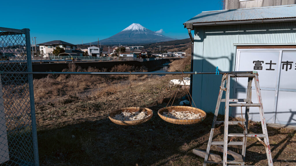 岳南富士岡駅から少し移動します。かんぴょうの天日干しと富士山。今度はトリプル富士ですな。
