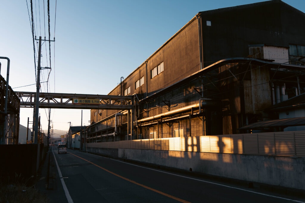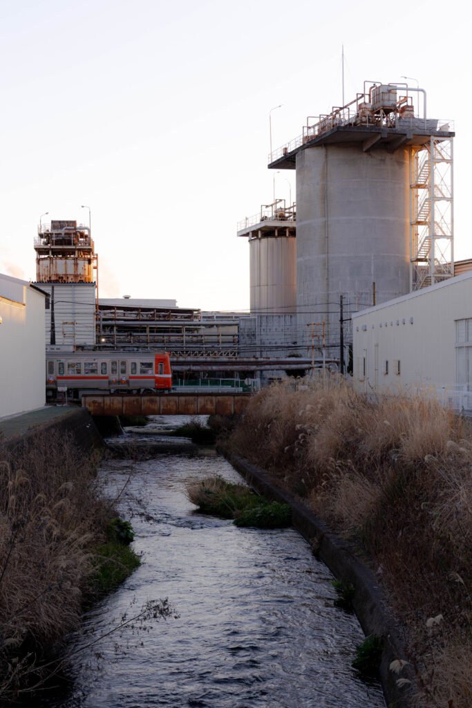 比奈駅方面を望む。奥に広がるのは、国内の製紙業で王子製紙に次ぐ二番手のシェアを誇る、日本製紙の富士工場。何本も伸びる煙突が、規模感を如実に伝えてくれます。
