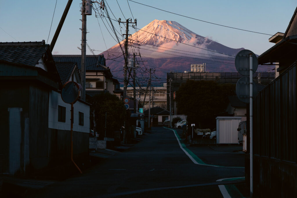 生活道路の先には、見事な紅富士が。千葉県から遥かに望む富士山とは全く印象の異なる、霊峰・富士の威厳がそこにあります。