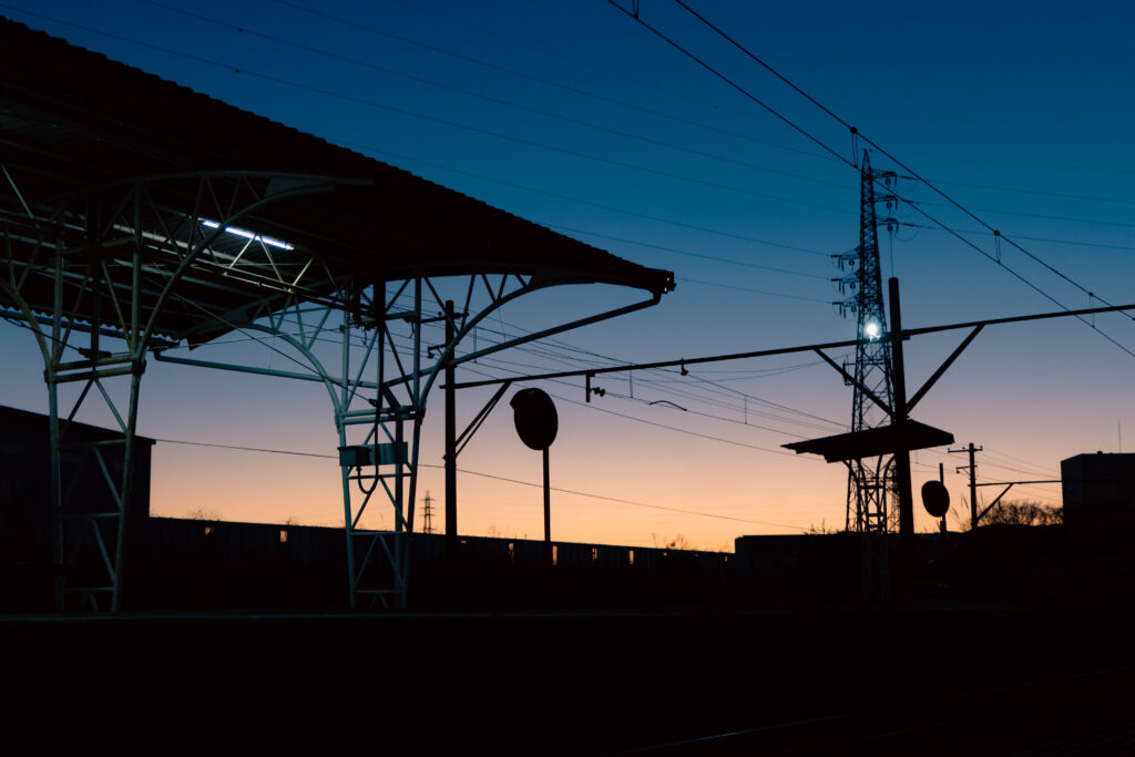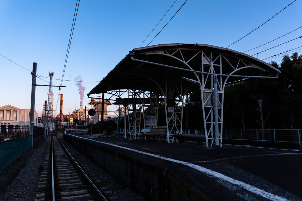 岳南原田駅から比奈駅まで歩いてみましょう。だいぶ日が傾いてきました。線路は工場施設に囲まれ、一足先に宵闇へと沈んでいきます。
