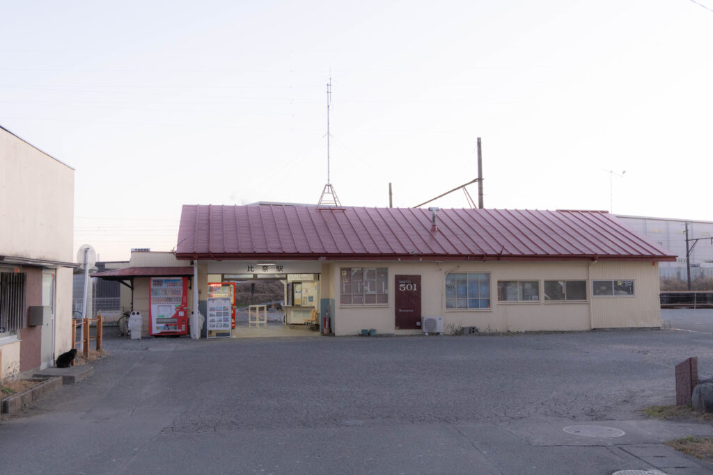 比奈駅に到着。かつて貨物列車の入換作業で賑わった拠点駅も、今では無人化され、ローカル駅のひとつに。