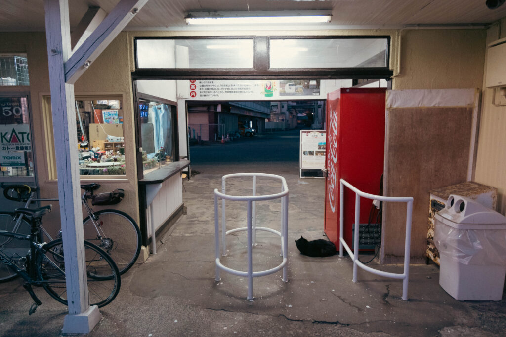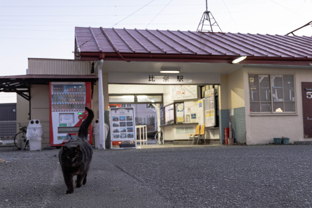 駅舎へ近づくと、左側から何やらのしのしと黒い塊が。この駅の主でしょうか?黒猫らしい、ずいぶんと人懐っこい子でした。駅舎を撮ろうとする度にフレームインしてくるのだけは、難儀しましたが。
