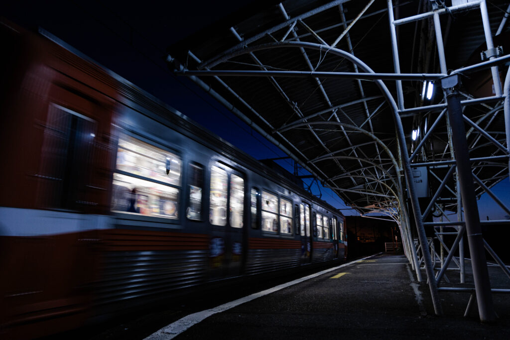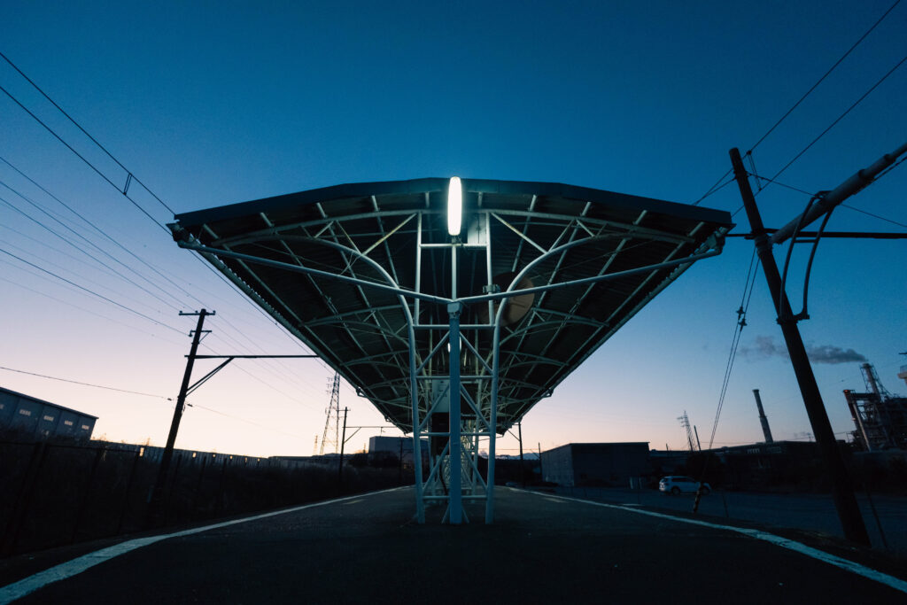 製紙輸送が華やかなりし時代を知っているマニアにとって、機関車やワムのいない今の岳南電車は、物足りないかもしれません。しかし。こうして宵闇に浮かぶキノコ型のシルエットに明かりが灯る限り、岳南電車の魂は消えやしないのだと、私は思うのです。