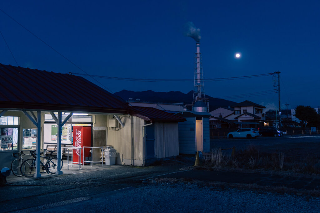 駅前には、某製紙工場の社員寮がありました。一階には宴会が日本料理店や中華料理店など、宴会場の機能も兼ねていそうな飲食店が軒を連ねています。ただ、日曜日だからなのか全てシャッターが下りており、物寂しい雰囲気。一台のタクシーが灯す明かりだけが、人の気配を感じさせます。
